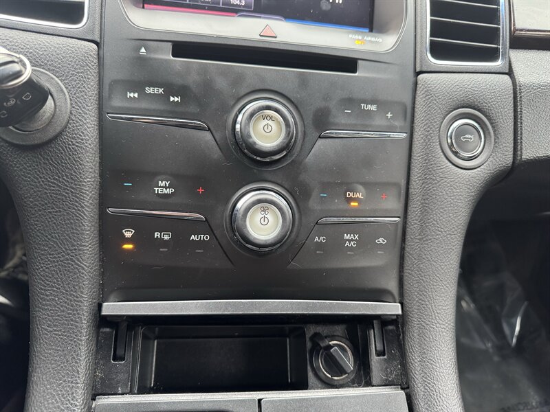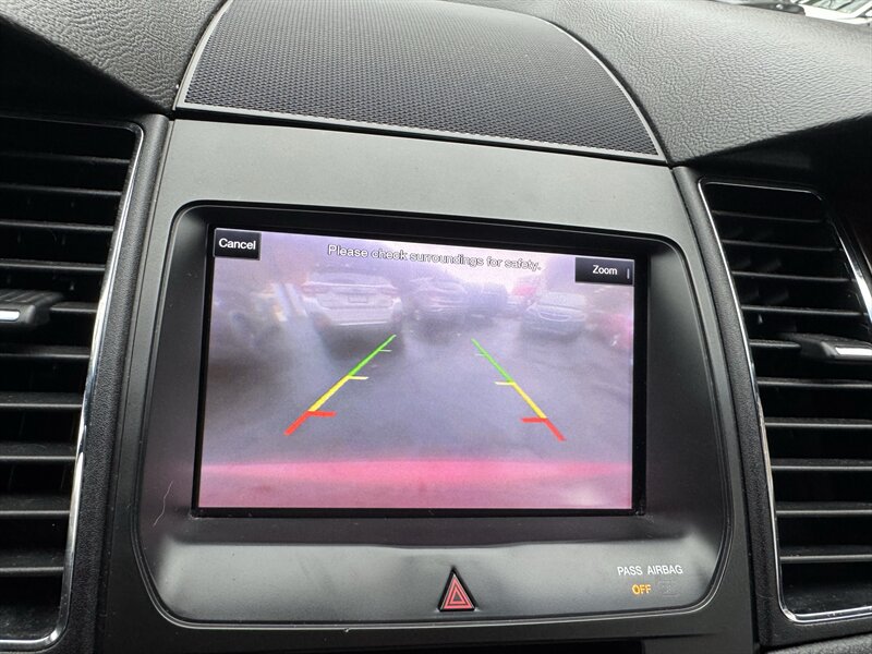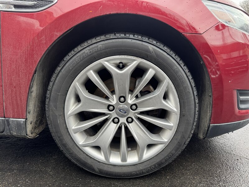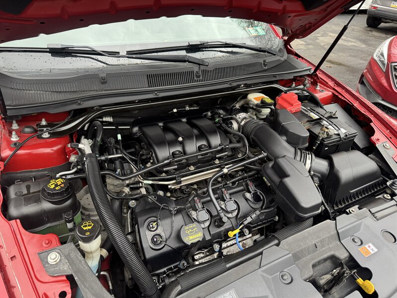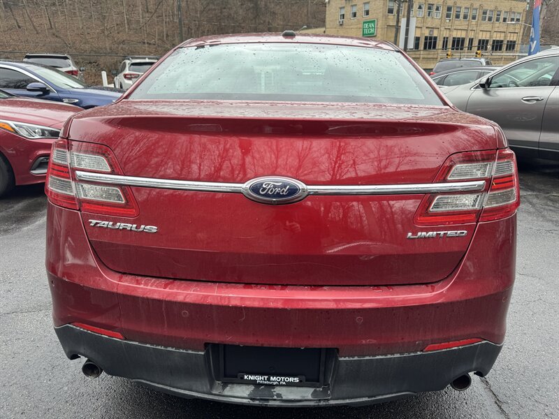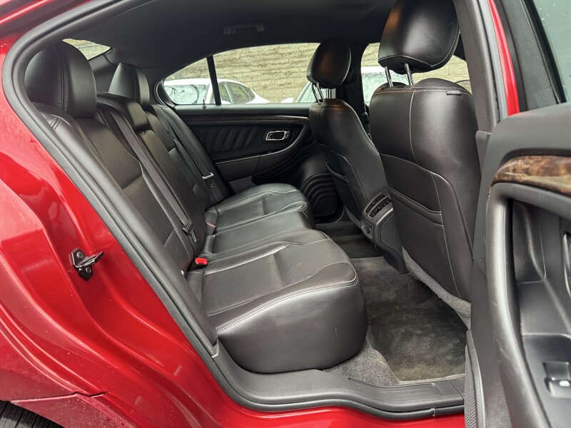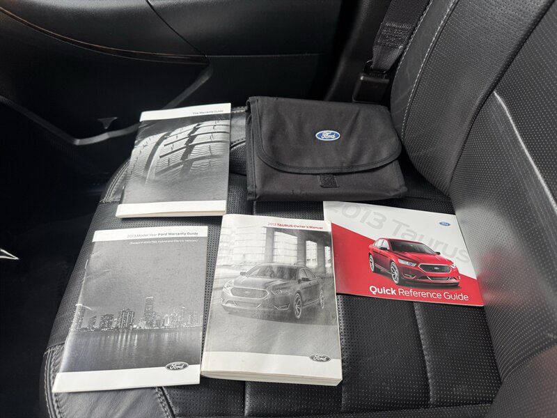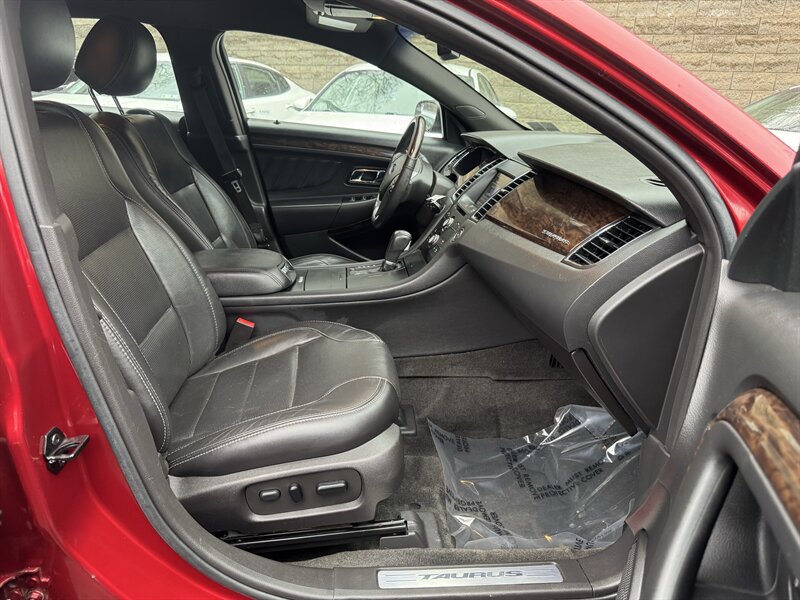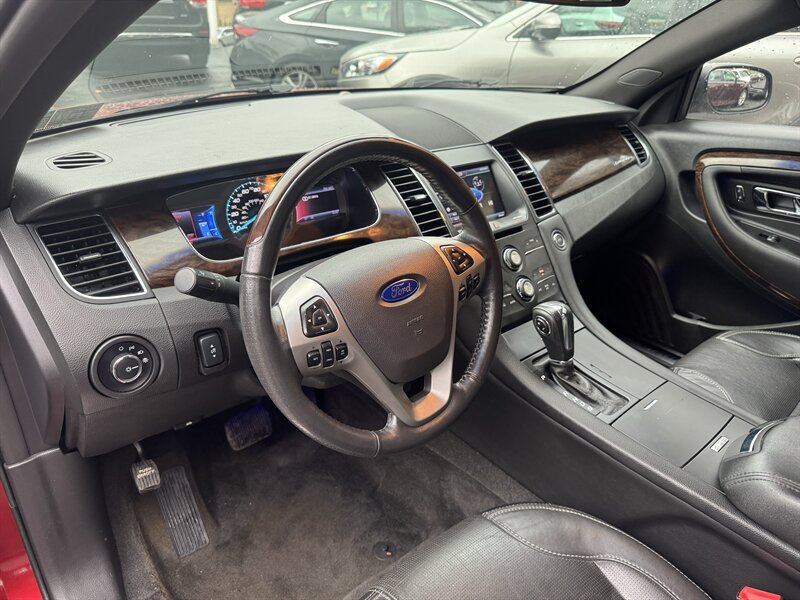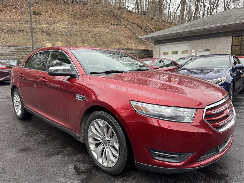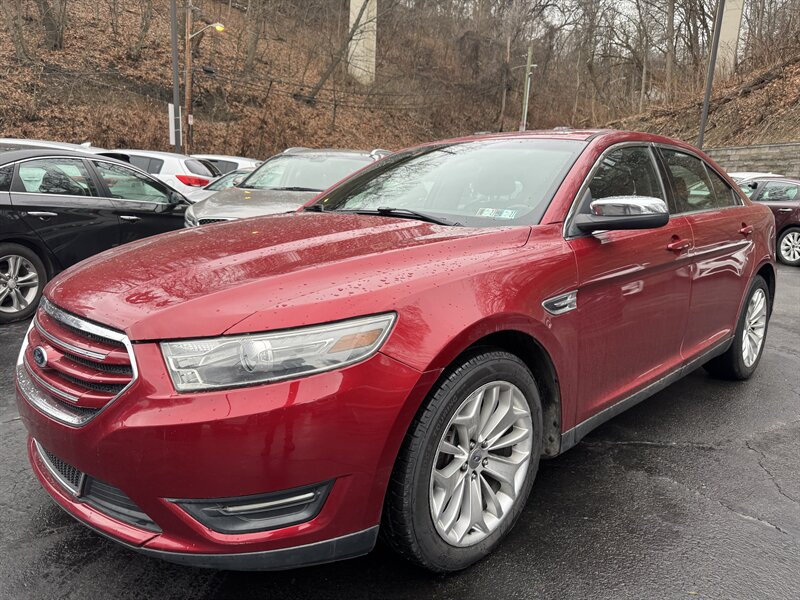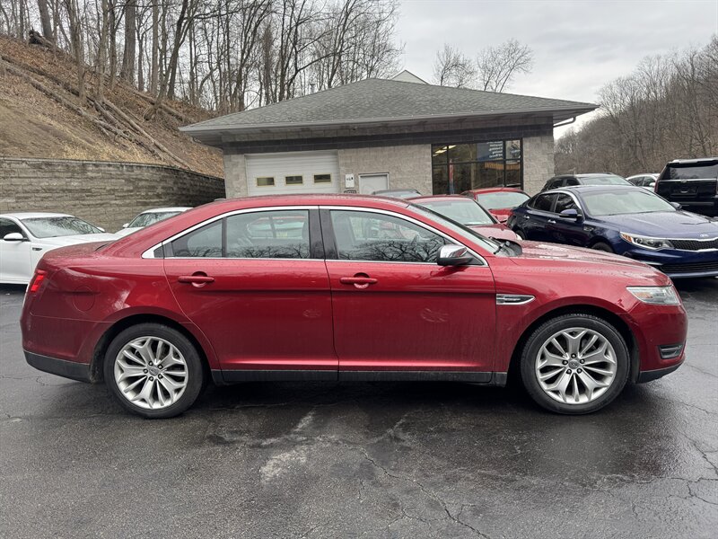 2013 Ford Taurus Limited in Ruby Red Metallic Tinted Clear Coat with Dune interior. Powered by a 3.5L V6 producing 288 hp and 254 lb-ft, paired with an automatic transmission. Factory equipment includes leather-trimmed seating in Dune with heated front seats and power-adjustable driver’s seating, dual-zone automatic climate control, leather-wrapped steering wheel with audio and cruise controls, power windows/locks/mirrors, remote keyless entry, Ford SYNC Bluetooth connectivity, a premium audio system with auxiliary/USB inputs, alloy wheels and fog lamps. Safety and stability systems include ABS, multiple airbags (front, side and curtain), traction and electronic stability control, and tire pressure monitoring. Below 96,000 miles (averaging under 7,000 miles per year) and rated at approximately 19 MPG city / 29 MPG highway.
