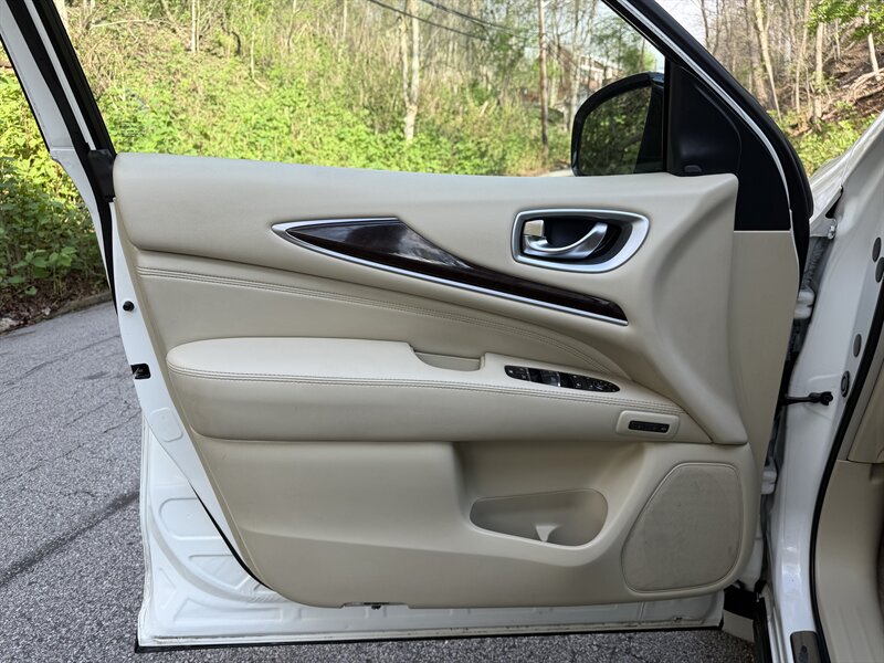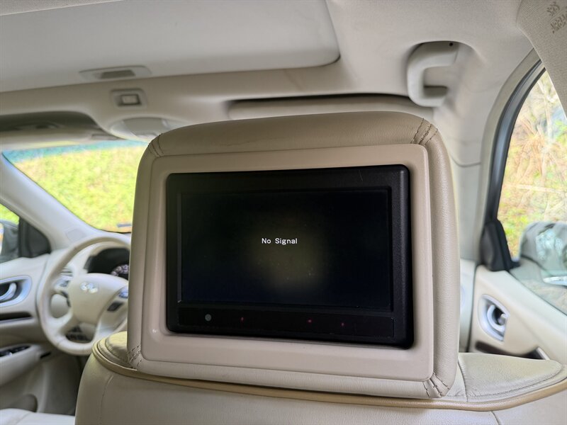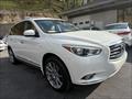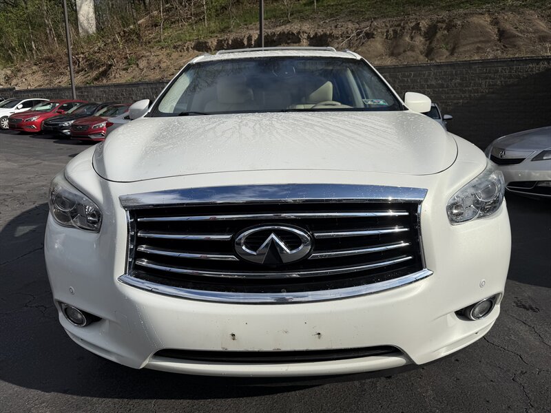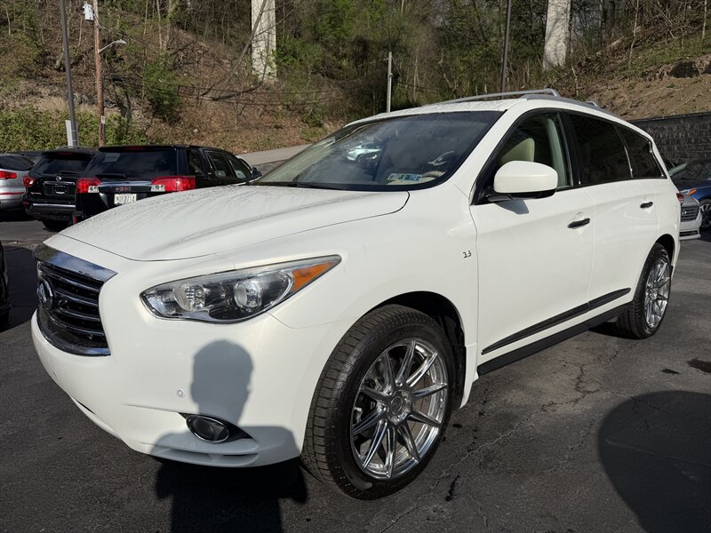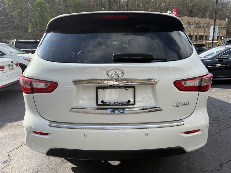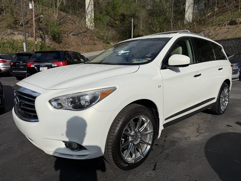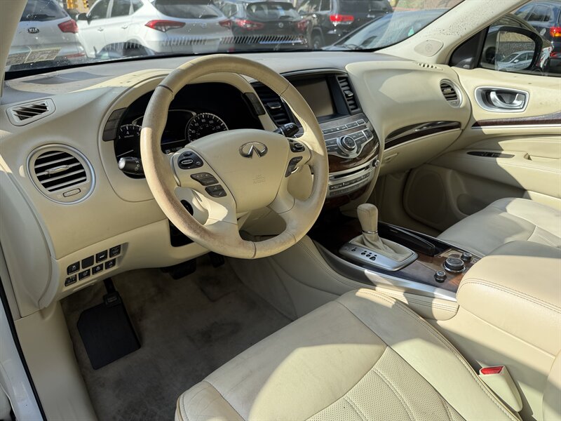 2014 INFINITI QX60 in Moonlight White with a Wheat interior, powered by a 3.5L V6 producing 265 hp and 248 lb-ft of torque paired with a continuously variable automatic transmission. This three-row luxury crossover comes factory-equipped with seating for seven, power-adjustable front seats, leather-appointed Wheat seating surfaces, tri-zone automatic climate control, and steering-wheel-mounted audio and cruise controls. Standard infotainment and convenience features include Bluetooth hands-free phone connectivity, AM/FM audio with auxiliary/USB inputs, a rearview camera, power windows and locks, remote keyless entry with push-button start, and roof rails. Safety systems from the factory include ABS, traction and stability control, front and side-impact airbags plus full-length side-curtain airbags for all three rows, child LATCH anchors, and tire pressure monitoring. This vehicle shows good mileage with under 111,000 miles (averaging less than 9,000 miles per year) and EPA ratings of 19 MPG city and 25 MPG highway.