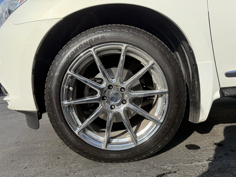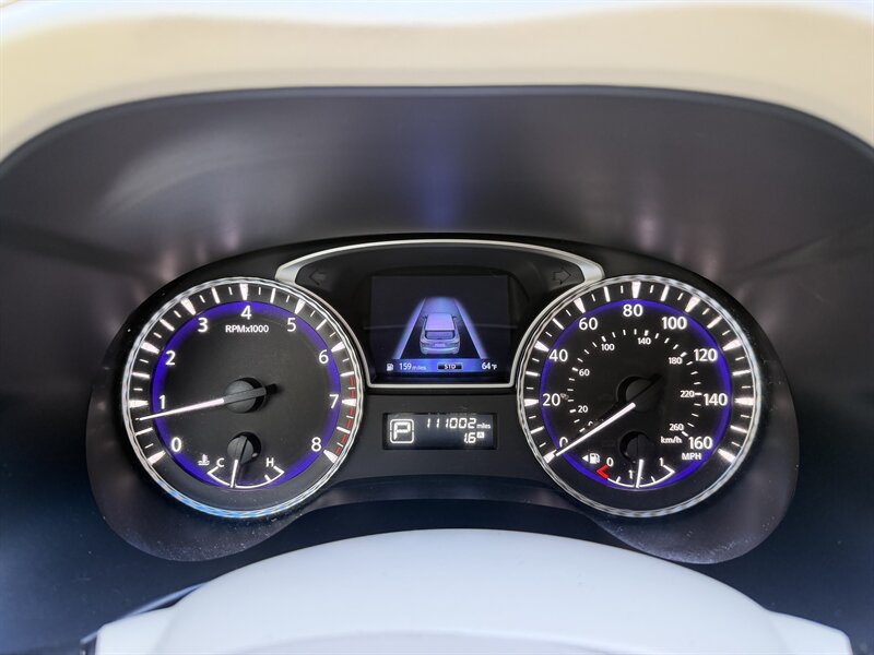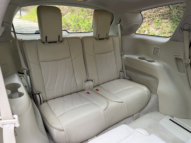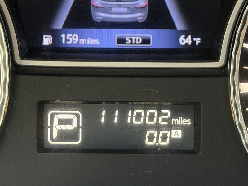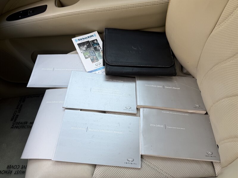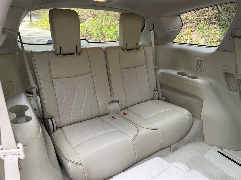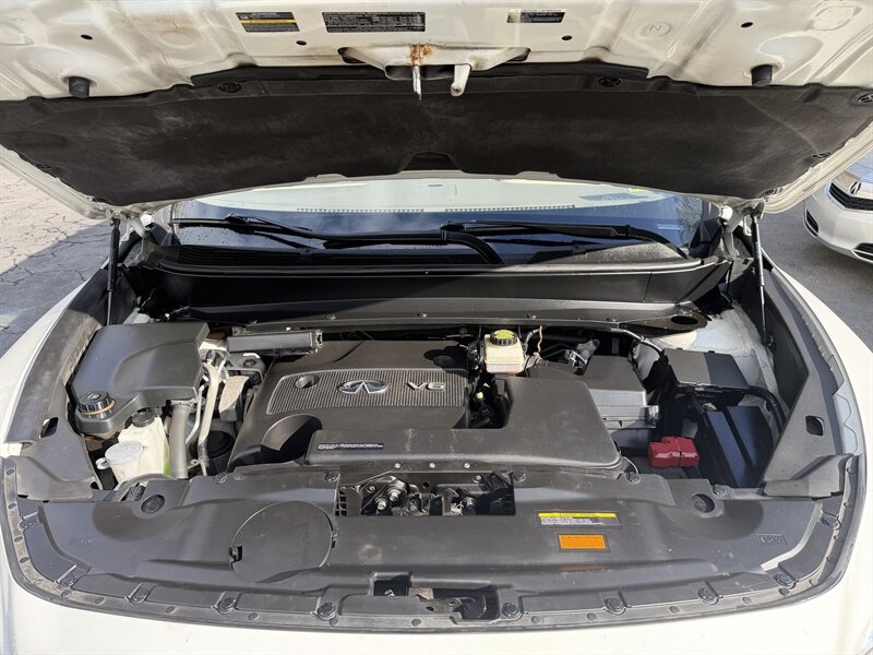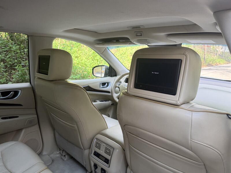2014 INFINITI QX60 in Moonlight White with a Wheat interior, powered by a 3.5L V6 producing 265 hp and 248 lb-ft of torque paired with a continuously variable automatic transmission. This three-row luxury crossover comes factory-equipped with seating for seven, power-adjustable front seats, leather-appointed Wheat seating surfaces, tri-zone automatic climate control, and steering-wheel-mounted audio and cruise controls. Standard infotainment and convenience features include Bluetooth hands-free phone connectivity, AM/FM audio with auxiliary/USB inputs, a rearview camera, power windows and locks, remote keyless entry with push-button start, and roof rails. Safety systems from the factory include ABS, traction and stability control, front and side-impact airbags plus full-length side-curtain airbags for all three rows, child LATCH anchors, and tire pressure monitoring. This vehicle shows good mileage with under 111,000 miles (averaging less than 9,000 miles per year) and EPA ratings of 19 MPG city and 25 MPG highway.