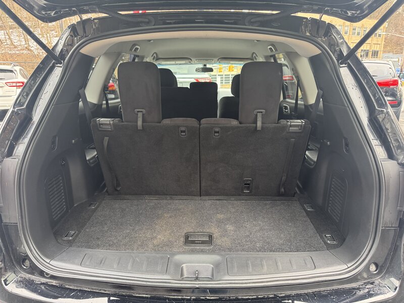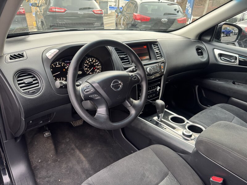 The exterior is finished in a sleek Super Black, providing a striking presence on the road, while the interior features a sophisticated Charcoal color scheme, designed for both style and durability. This Pathfinder S is equipped with a range of factory default features, including: