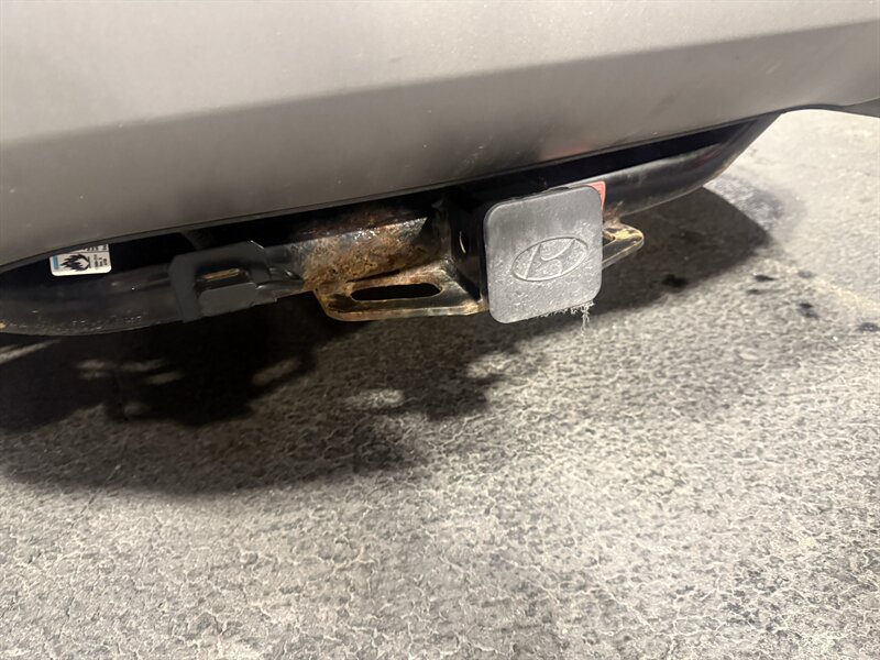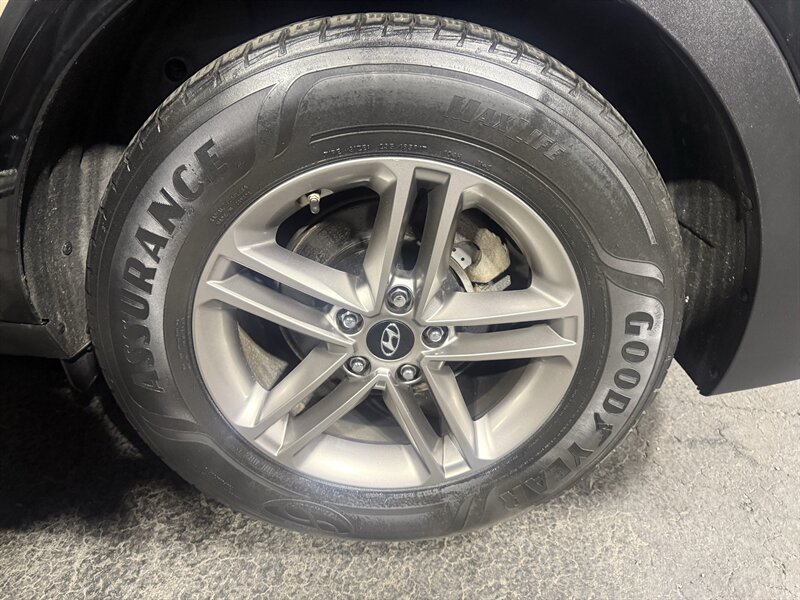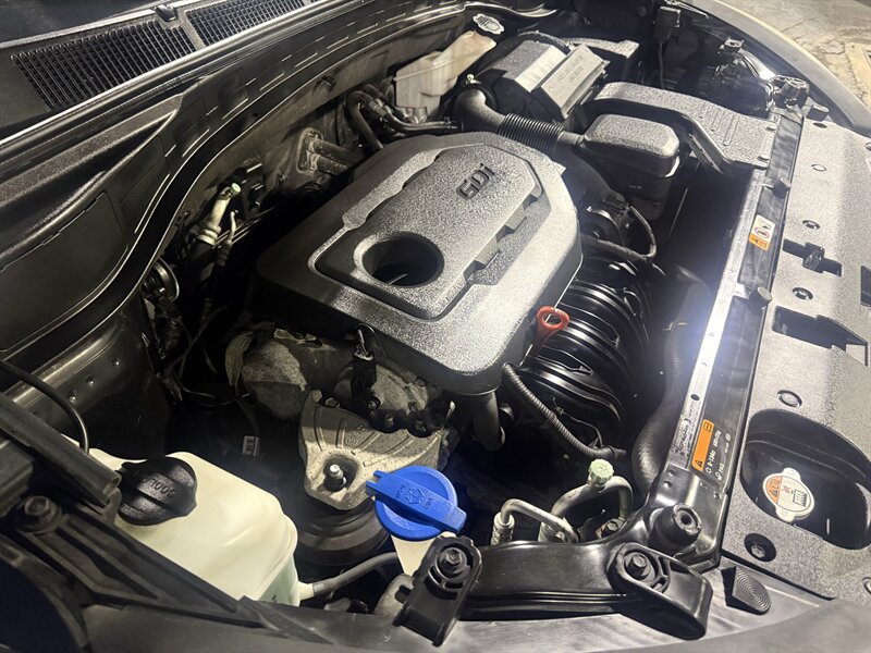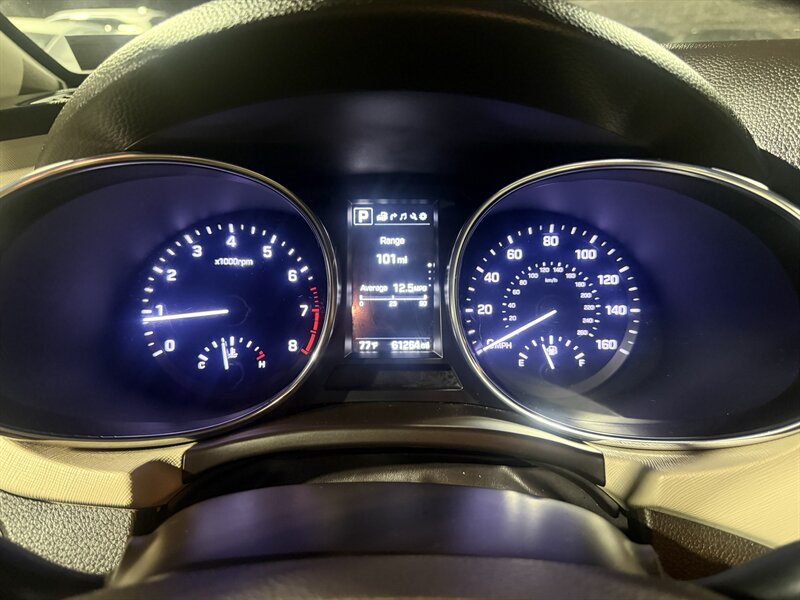 2017 Hyundai SANTA FE Sport 2.4L, powered by the Theta II 2.4L I4 (185 hp, 178 lb-ft), paired with an automatic transmission; EPA fuel economy is 21 MPG city and 27 MPG highway, and this example has under 62,000 miles (averaging <7,000 miles/year). Factory-standard equipment typically includes front-wheel drive (AWD optional), 17-inch alloy wheels, cloth seating with 60/40 split-folding rear seats, air conditioning, power windows and locks, remote keyless entry, cruise control, tilt/telescoping steering column, steering-wheel audio and phone controls, Bluetooth hands-free and audio streaming, USB/Aux inputs with AM/FM/CD audio, a rearview camera, ABS with electronic stability and traction control, and multiple airbags. Exterior is Twilight Black with a Gray interior.