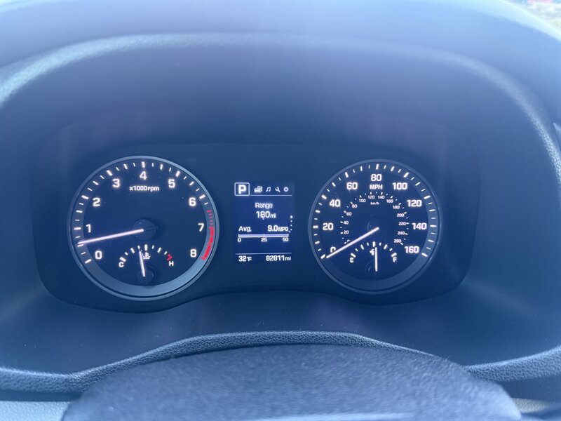2017 Hyundai Tucson SE in Coliseum Gray with a Black interior, powered by the factory 2.0L I4 (164 hp, 151 lb-ft) paired to an automatic. Factory-standard equipment includes cloth seating, air conditioning, power windows and door locks, remote keyless entry, cruise control, a tilt-and-telescoping steering wheel with audio/phone controls, Bluetooth hands-free and audio streaming, AM/FM audio with USB/Aux inputs, a rearview camera, daytime running lights, 16-inch alloy wheels, and standard safety systems such as ABS, multiple airbags, traction control and electronic stability control. This vehicle has good mileage (under 83,000 miles, averaging less than 9,000 miles per year) and EPA-estimated fuel economy of 23 MPG city / 30 MPG highway.
