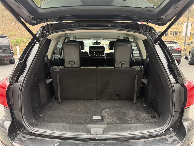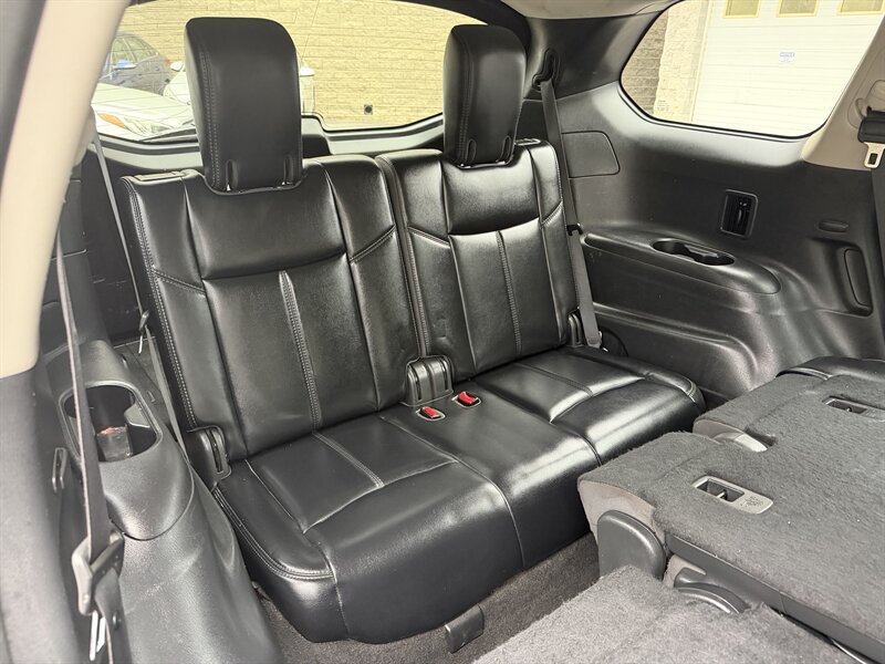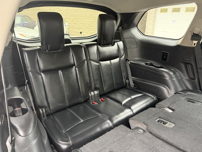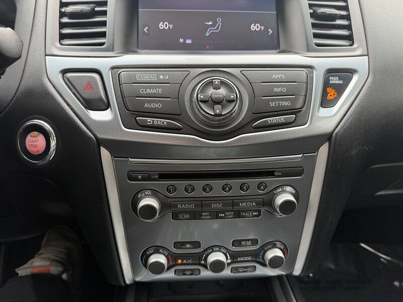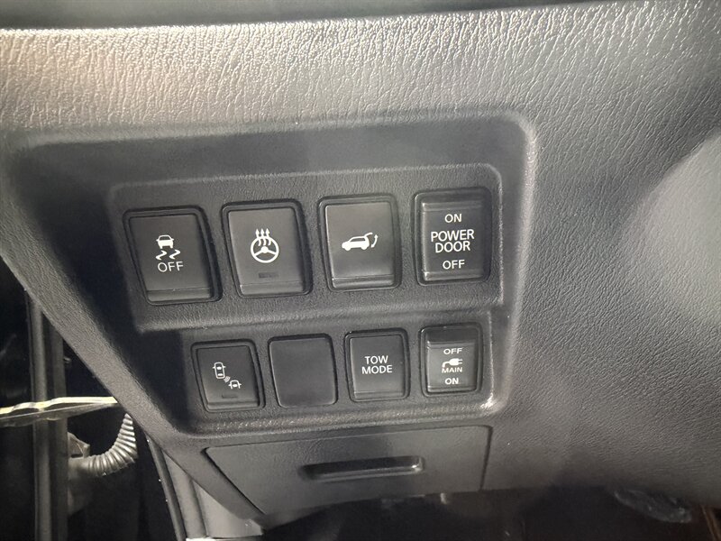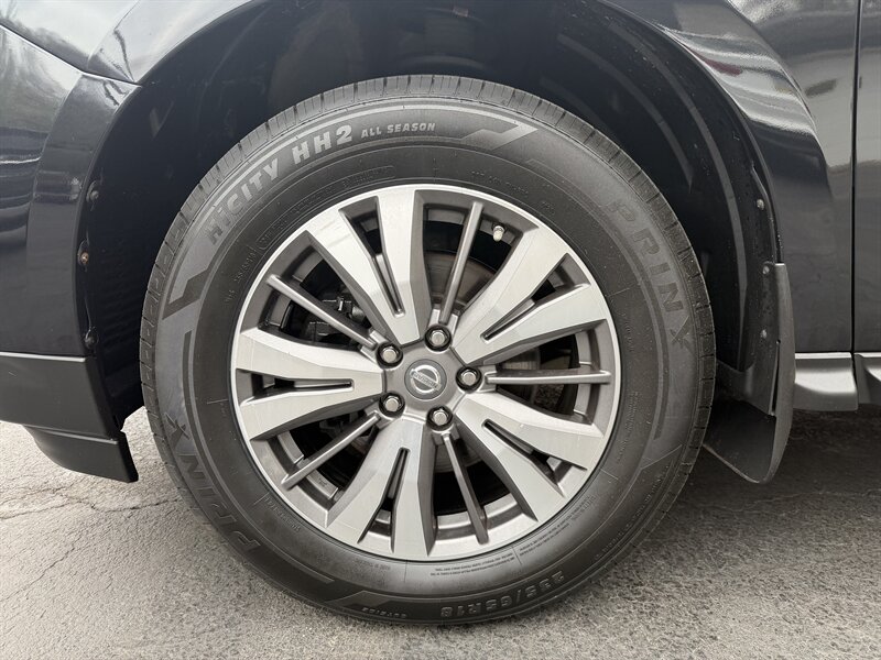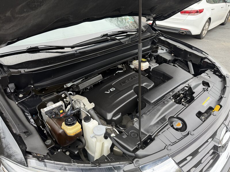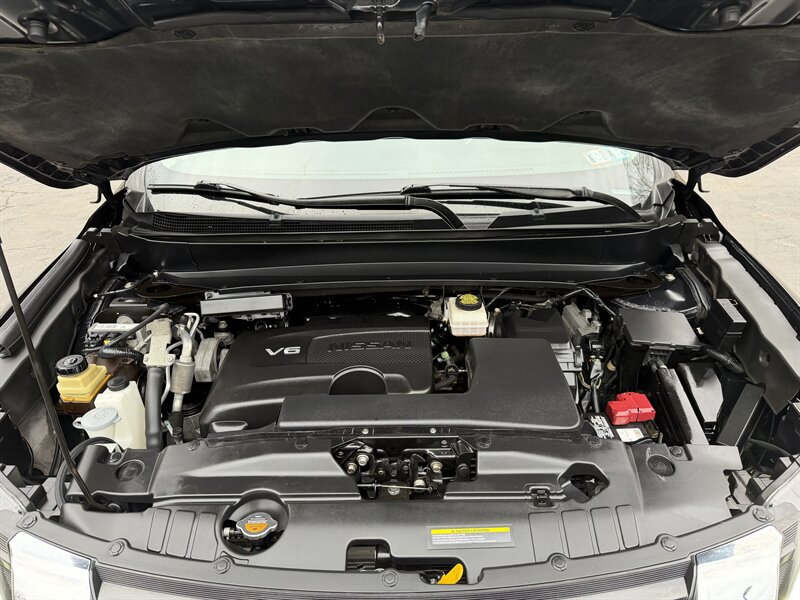 Factory-equipped SL features include seating for up to seven with a fold-flat third row, leather-appointed seating surfaces, heated front seats and power-adjustable driver’s seat, tri-zone automatic climate control, keyless entry with push-button start and remote start, rearview camera, Bluetooth hands-free phone and audio streaming, steering-wheel audio and cruise controls, alloy wheels and roof rails, and a standard infotainment system with AM/FM, USB/AUX inputs and a touchscreen interface. Standard drivetrain is the 3.5L V6 paired with Nissan’s CVT; available all-wheel drive was offered from the factory.