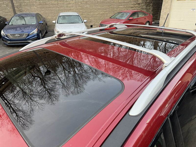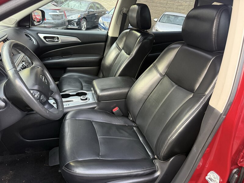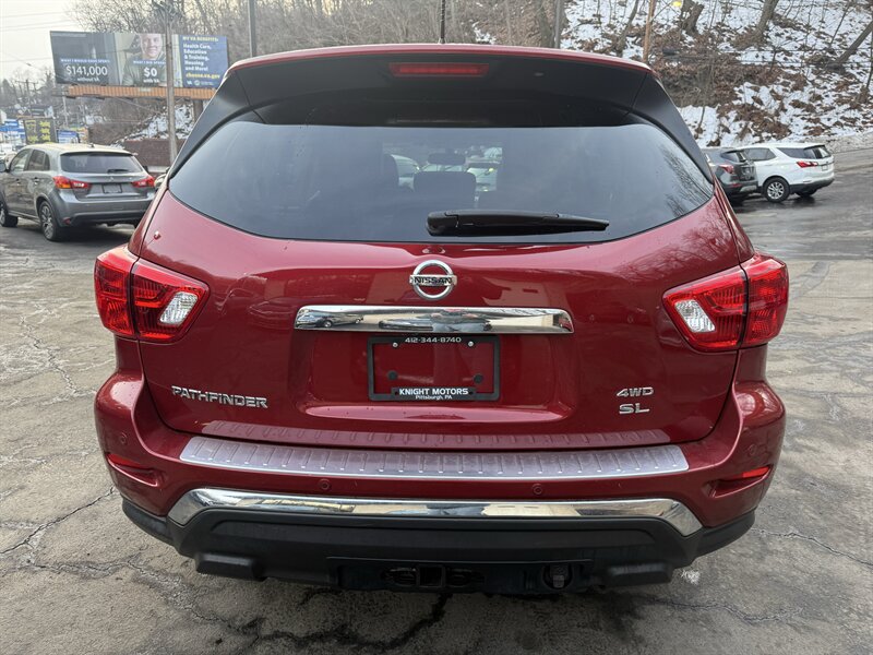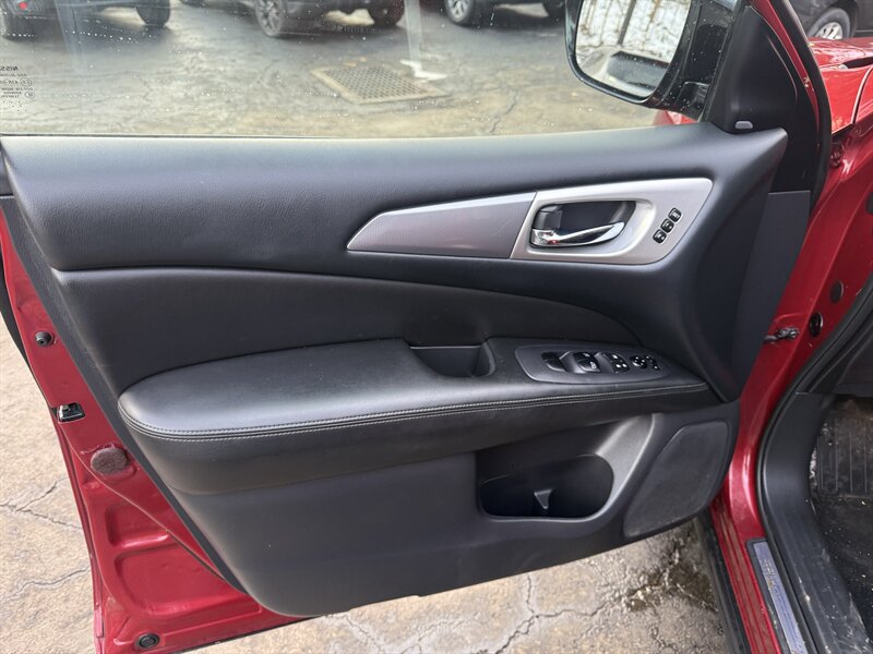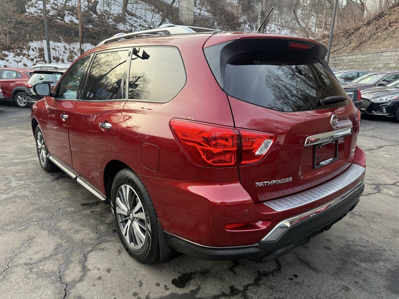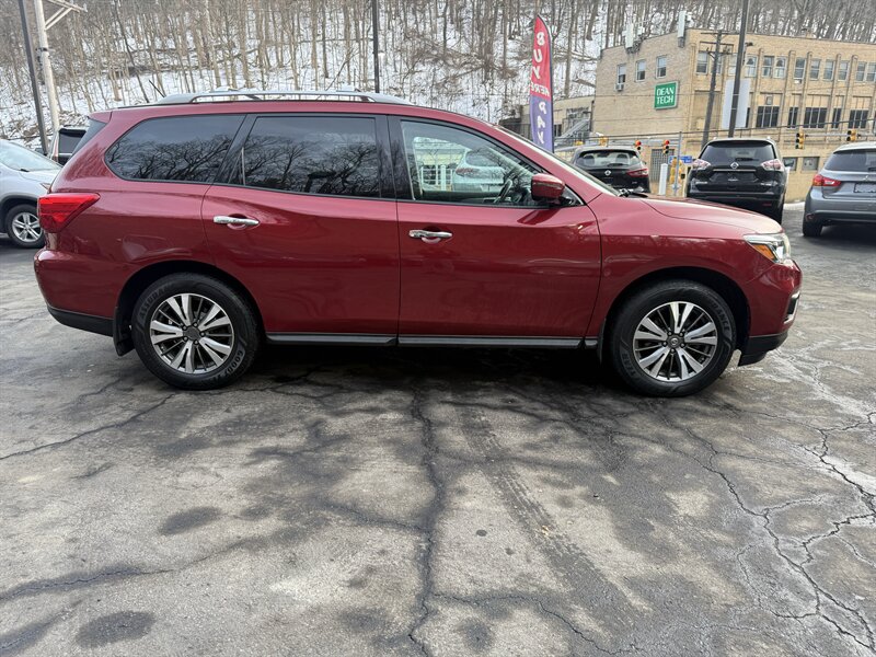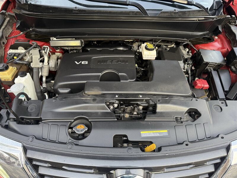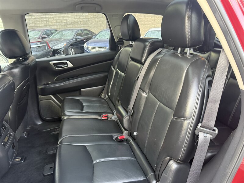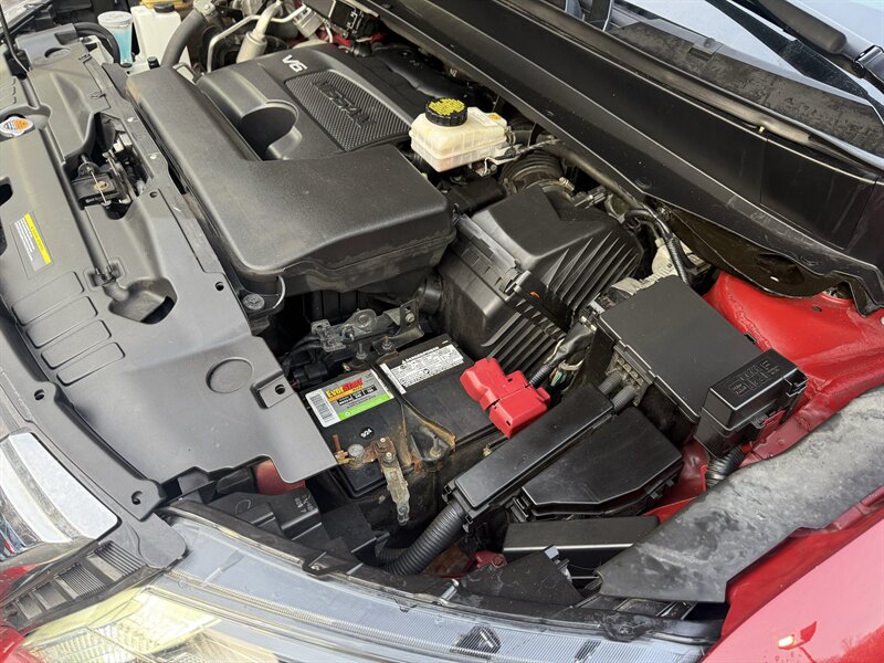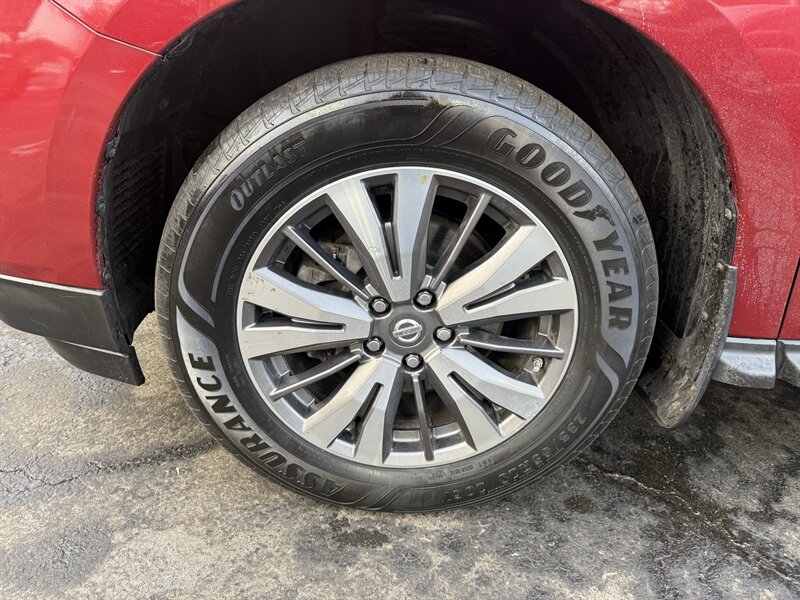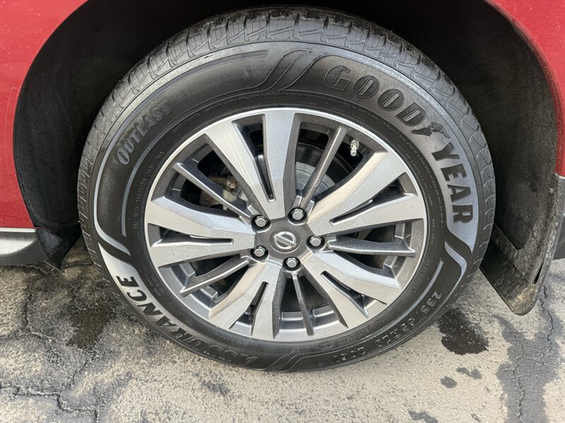 2017 Nissan Pathfinder SL in Cayenne Red with Charcoal interior, powered by a 3.5L V6 (284 hp, 259 lb-ft). Well-maintained with under 91,000 miles (averaging <10,000 miles/year) and EPA ratings of 19 MPG city / 26 MPG highway. Factory-equipped SL features include three-row seating for up to seven with leather-appointed surfaces, power-adjustable driver seat and heated front seats, tri-zone automatic climate control, touchscreen infotainment with Bluetooth and USB/AUX inputs (NissanConnect-capable), steering-wheel audio and cruise controls, keyless entry with push-button start, power liftgate, roof rails, alloy wheels, rearview camera and rear parking sensors, plus ABS, traction and stability control and multiple airbags.