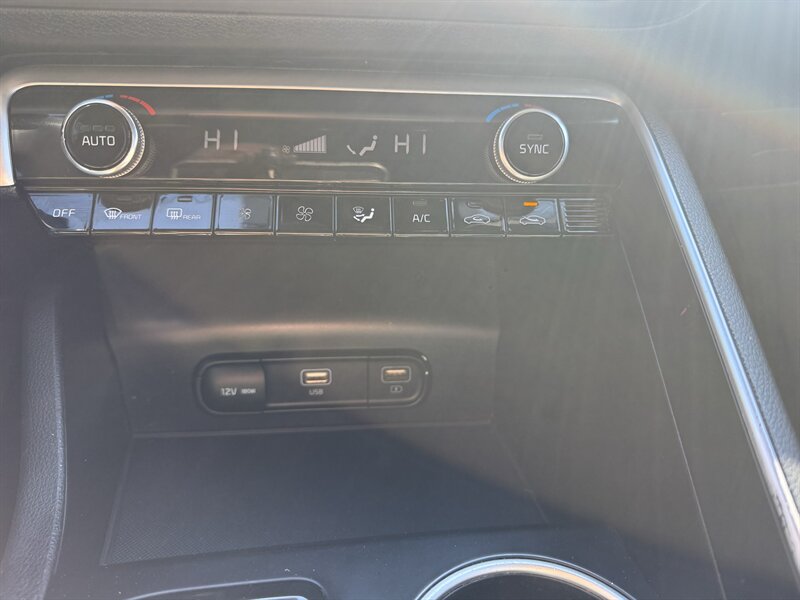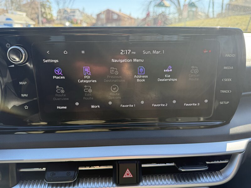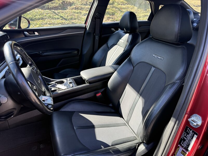 Factory-standard equipment includes: sport-styled exterior trim with GT-Line accents, LED headlights/taillights and daytime running lights, alloy wheels, an 8-inch touchscreen infotainment system with Apple CarPlay/Android Auto, Bluetooth and USB connectivity, a multi-function steering wheel, power accessories and remote keyless entry with push-button start, dual-zone automatic climate control, black sport-style seating and interior trim, and a full suite of Kia SmartSense driver-assistance features (including forward collision-avoidance, lane-keeping/ lane-following support, blind-spot/ rear-cross-traffic alerts and driver attention warning) along with a rearview camera.