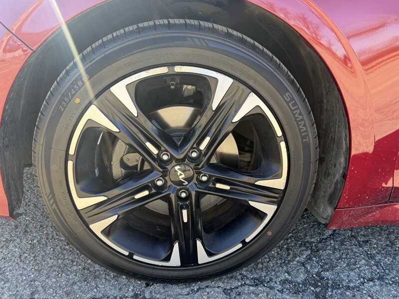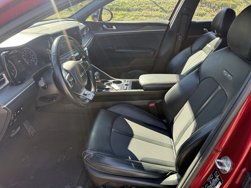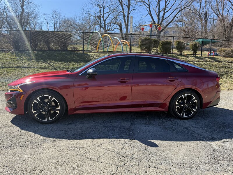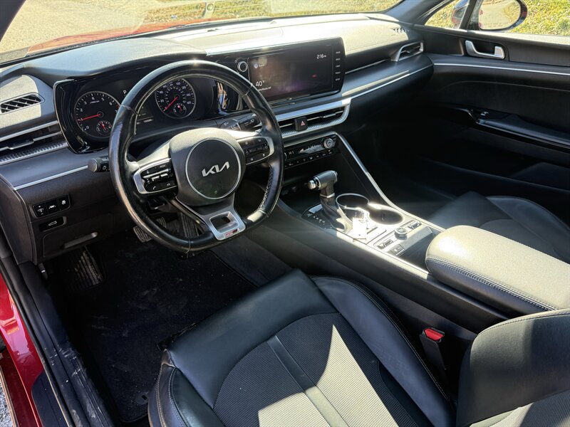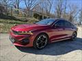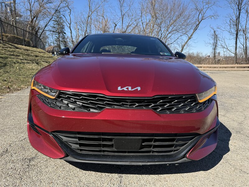 2022 Kia K5 GT-Line — Passion Red Tintcoat exterior with a Black interior. Powered by a 1.6L turbocharged I4 producing 180 hp and 195 lb-ft, paired to an automatic and front-wheel drive; EPA fuel economy is 27 MPG city / 37 MPG highway.